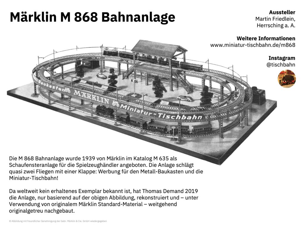 Von dieser Bahnanlage ist in der Sammlerszene weltweit kein erhaltenes Originalexemplar bekannt. Das hat 2019 den Tüftler Thomas Demand herausgefordert, nur basierend auf der obigen Abbildung (selbst die Beschreibung zur Anlage aus dem Katalog M 635 lag ihm nicht vor!), die Anlage in mühsamer Detailarbeit zu rekonstruieren und weitgehend originalgetreu nachzubauen. Es ist ihm dabei z. B. gelungen, die Ausmaße der Platte relativ exakt zu ermitteln (im Original mit den Maßen 161 x 85 cm, der Nachbau ist wenige cm größer). Thomas hat den m. W. einzigen überhaupt existierenden Nachbau der M 868 Bahnanlage erschaffen. Ich habe die Anlage 2022 von ihm übernehmen können und seitdem in einigen Details weiterentwickelt.